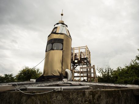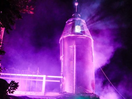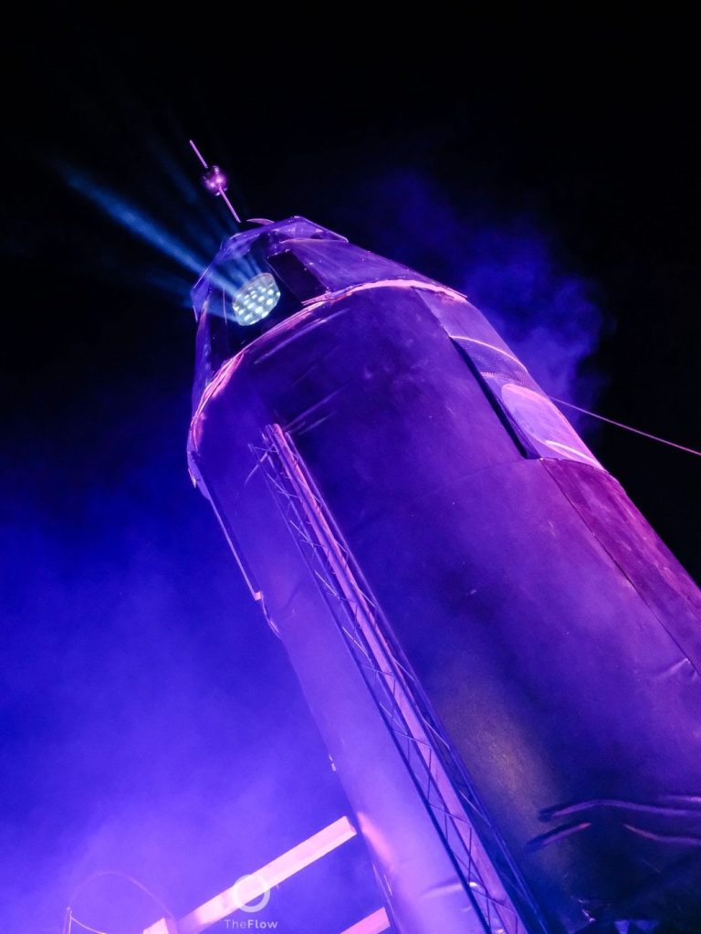 Eventbühne in Form einer begehbaren Goldenen Rakete. Tanzfläche befindet sich unter der Rakete.