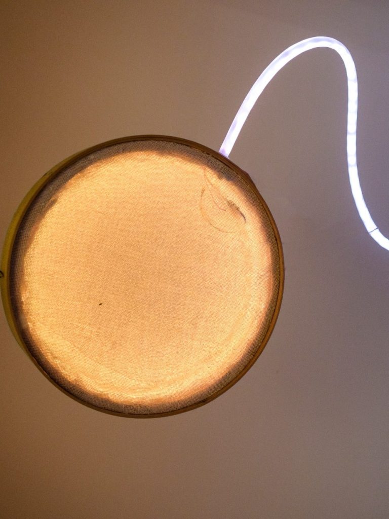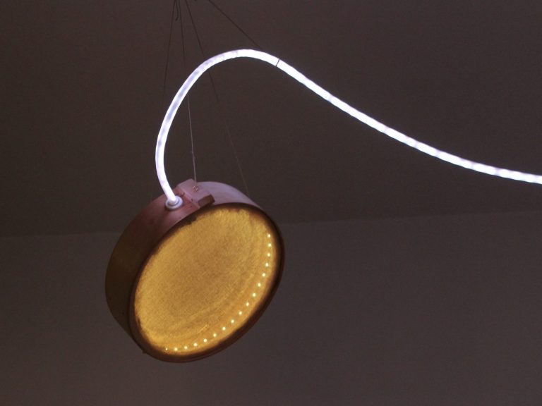 Zentrum der Installation ist eine Milchkanne. Von dem Zentrum führen vier Schläuche zu jeweils einem mit Käsetuch bespanntem Käsering. Die Programmierung läuft von den Schläuchen in die Käseringe und lässt diese aufleuchten.